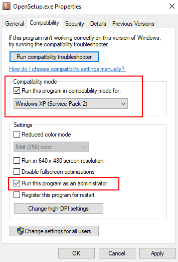 Right click on OpenSetup.exe, go to Compatibility tab, tick Run as Administrator, tick on Compatibility Mode and choose Windows XP SP2/SP3.